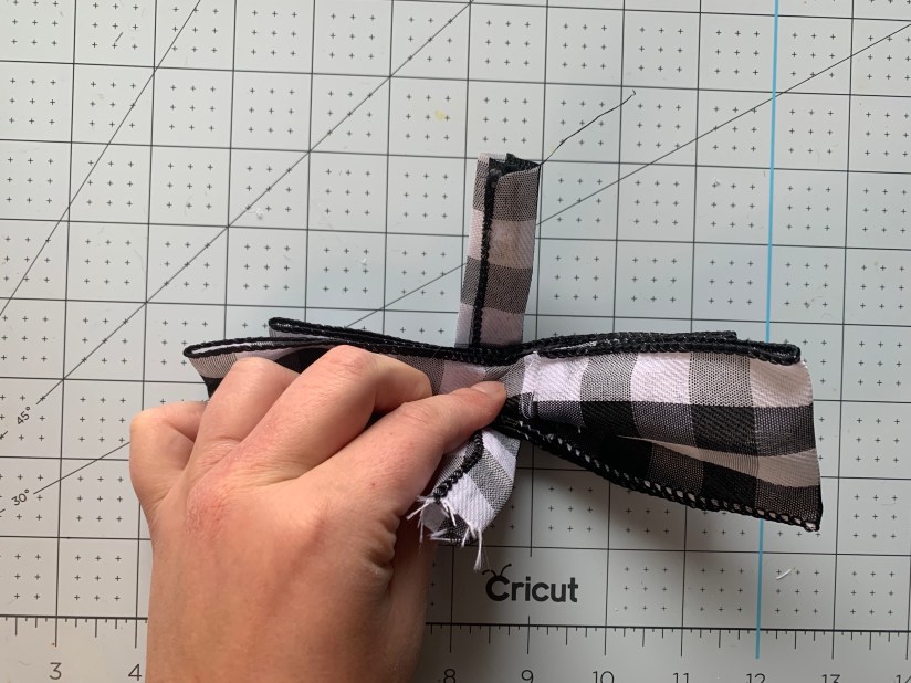 Center the completed 12 and 16inch ribbons, pinch the middle and use the 6inch ribbon to tie them together. You can glue down the ends of the 6 inch ribbon if they are still sticking out.